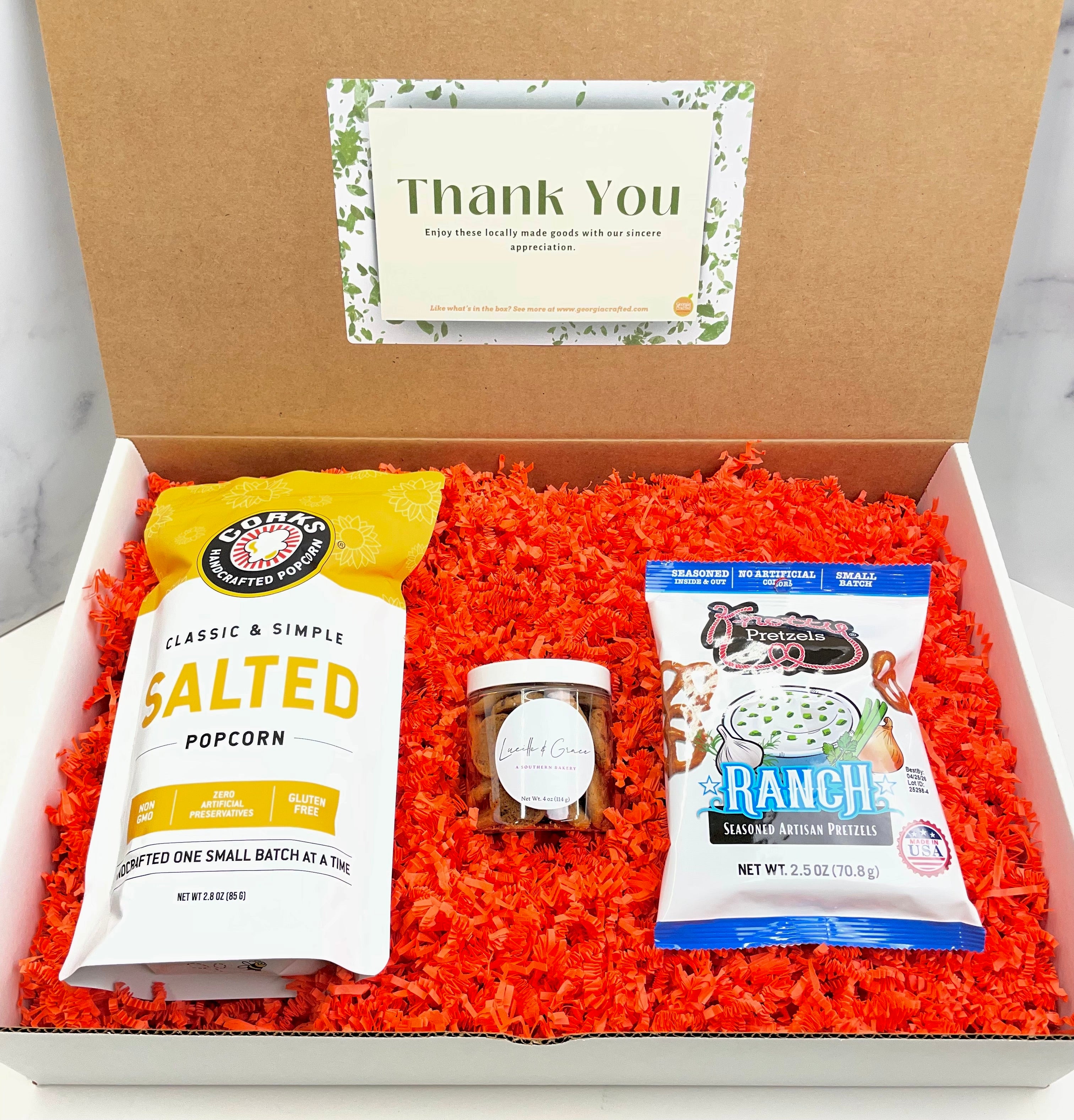 This "mini" version of our thoughtfully curated Thank You Gift Box features a taste of some of Georgia’s finest small-batch snacks.