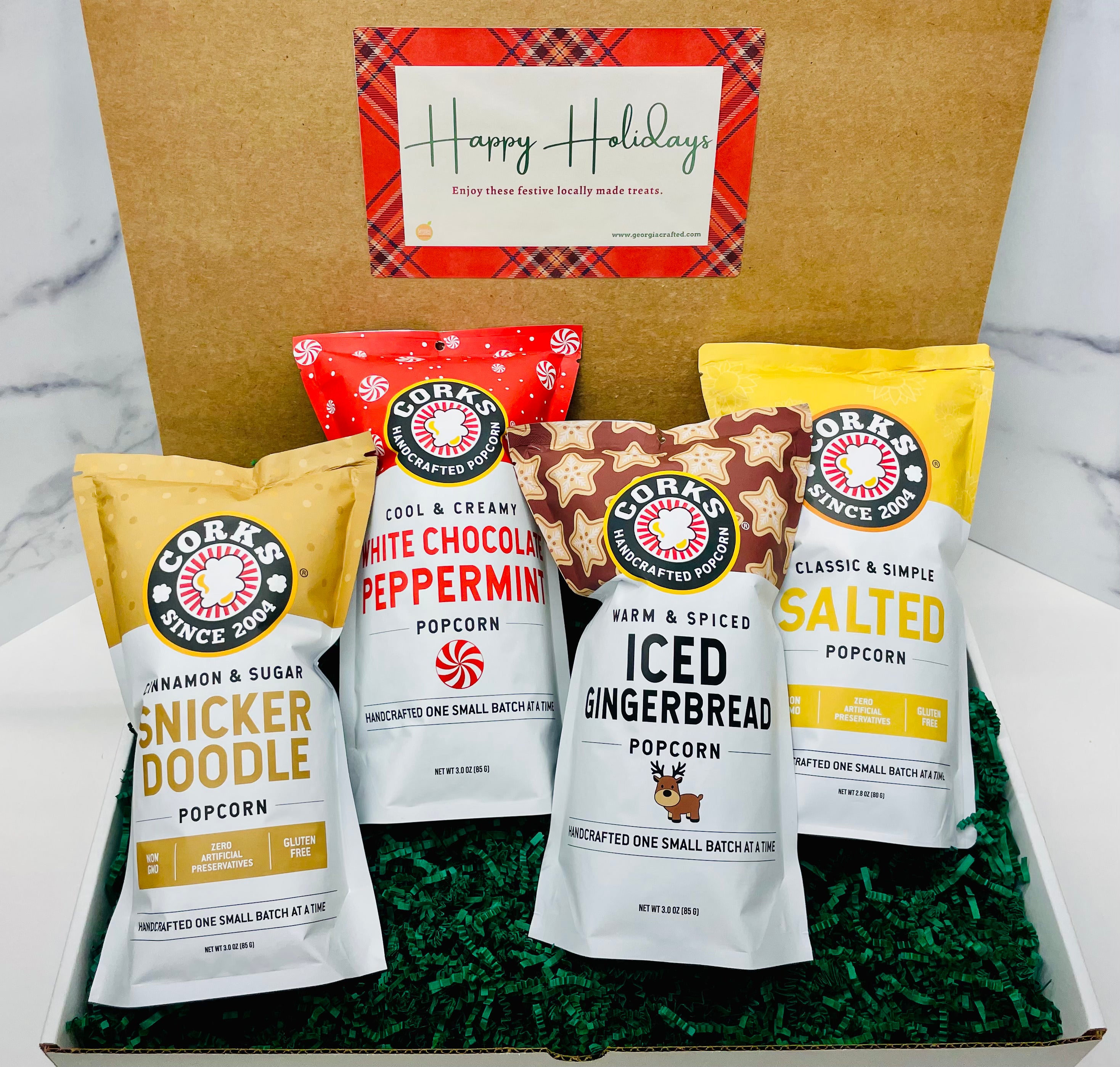 Introducing the Popcorn Lovers Delight — a gift box made for anyone who believes popcorn is the main event! Packed with four gourmet flavors from Cork’s Popcorn, each batch is handcrafted right here in Georgia for the ultimate sweet-and-salty snacking experience.